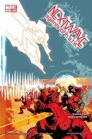 Aaron Stack (Machine Man) takes on Fin Fang Foom in a knock-down drag-out slug-fest! While his robotic body digests in Fin's belly, the rest of the NEXTWAVE squad has to defeat H.A.T.E.'s deadly Human Resource Department!
